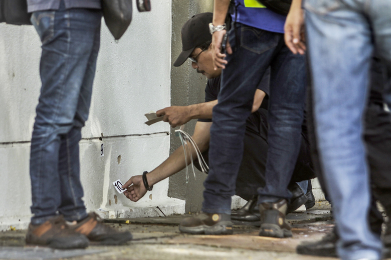 Royal Malaysian Police forensic officers collect evidence at the crime scene where Palestinian scientist Fadi al-Batsh was reportedly assassinated in a drive-by motorcycle shooting in Kuala Lumpur on April 21, 2018.