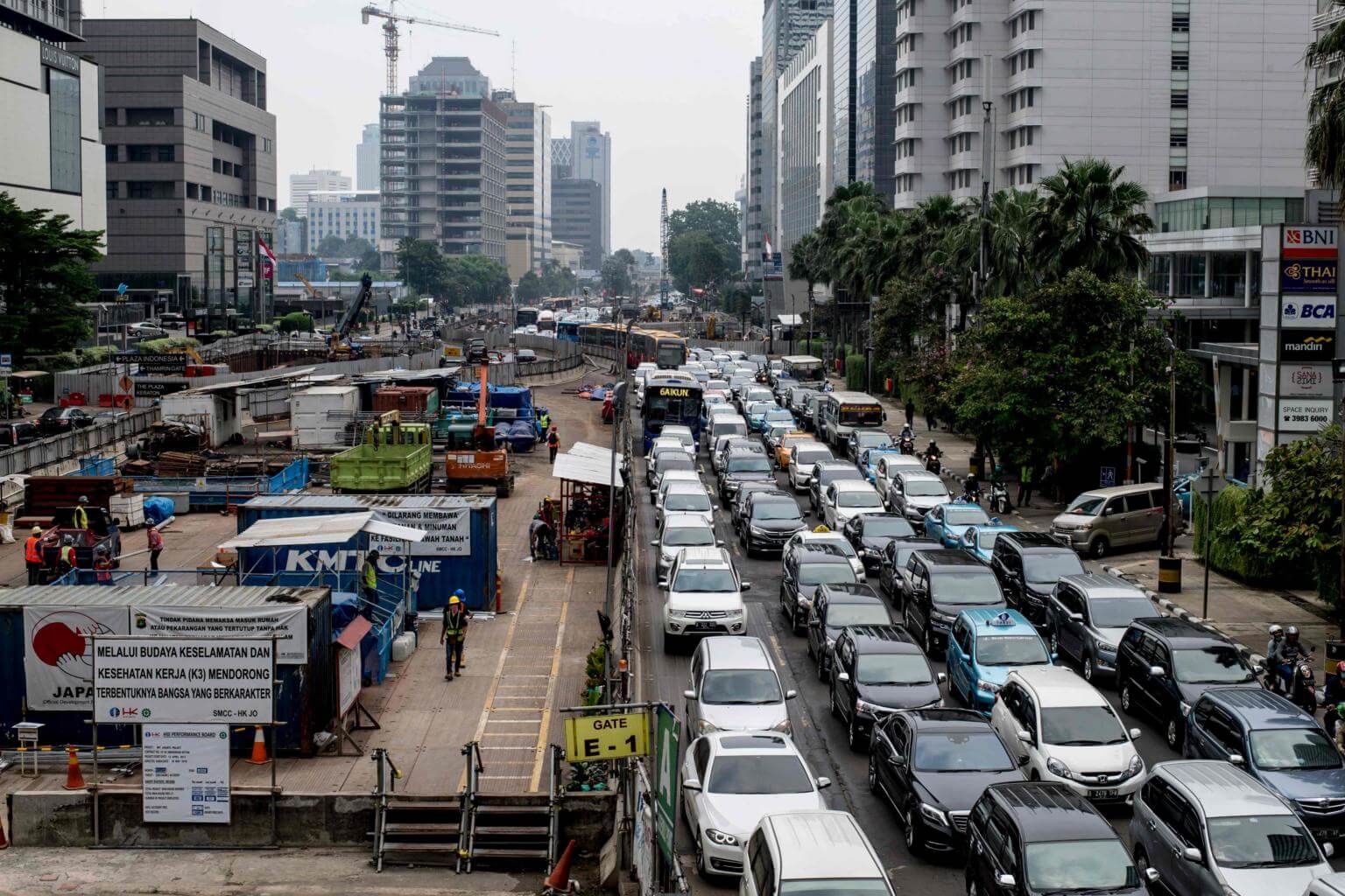 Motorists on the road next to a mass rapid transit construction site in Jakarta on March 6, 2018.