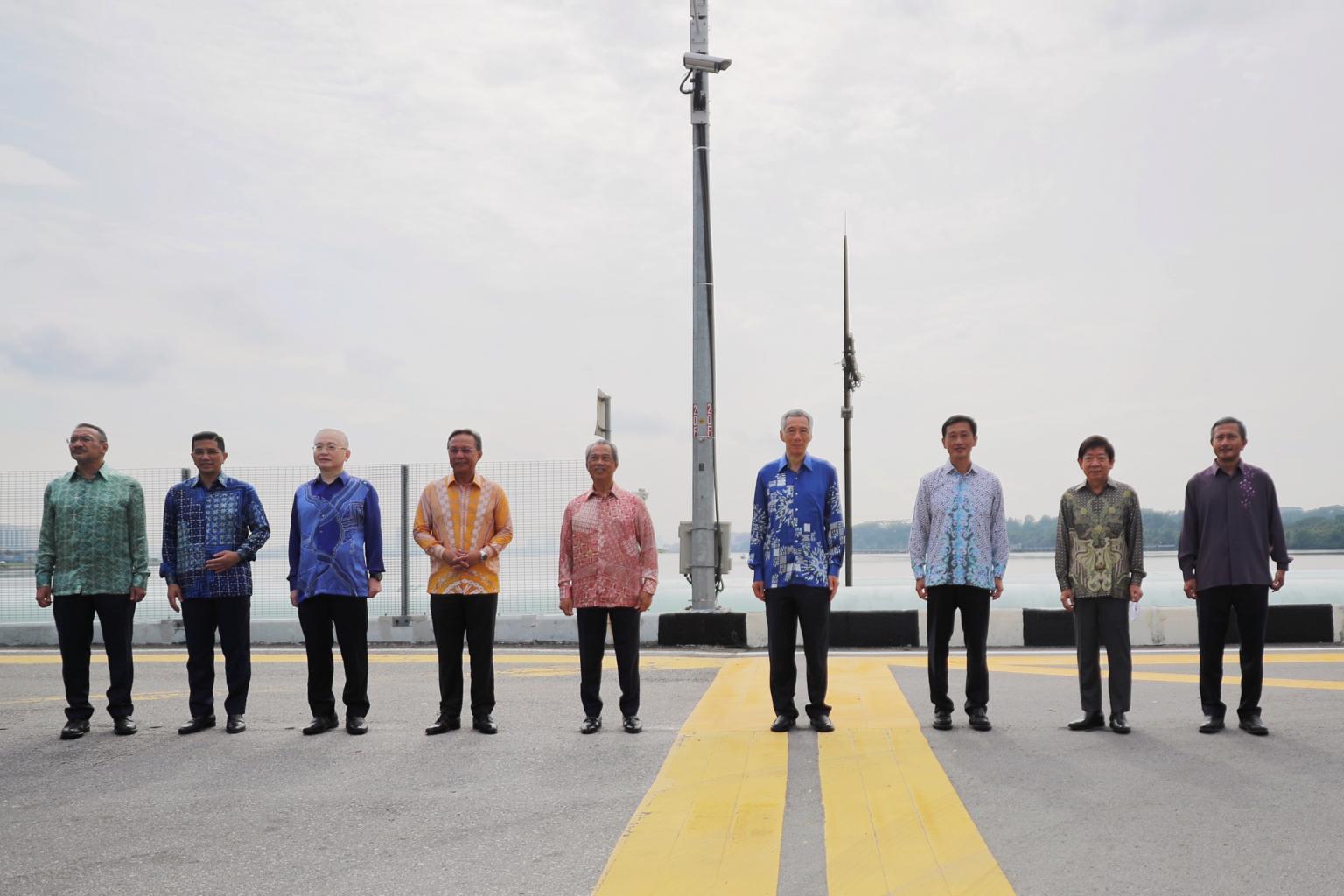 (From left) Malaysia's Foreign Minister Hishammuddin Hussein, Finance and Economics Senior Minister Azmin Ali, Transport Minister Wee Ka Siong, Johor Menteri Besar Haji Hasni bin Haji Mohammad, Malaysian PM Muhyiddin Yassin, Singapore PM Lee Hsien Loong, Transport Minister Ong Ye Kung, Mr Khaw Boon Wan and Foreign Minister Vivian Balakrishnan.