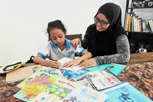 Hard at work: Ms Noraini Mokhtar (right) helping her daughter Aleesha with her homework after she returns from school in Singapore at their home in Taman Majidee, Johor Baru.