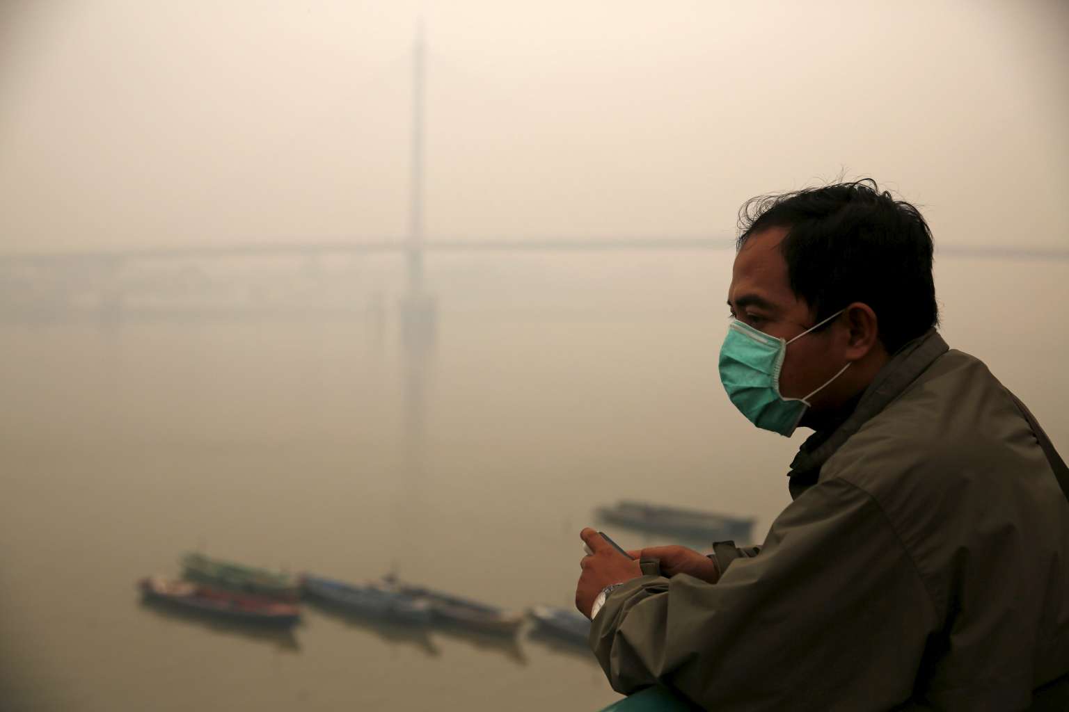 A worker stands as the haze shrouded Batanghari River in Jambi, on Indonesia's Sumatra island, on Sept 15, 2015.