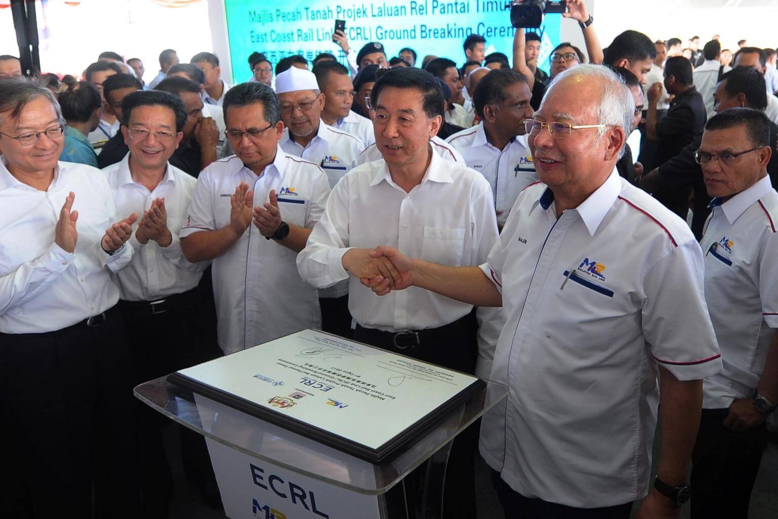 Malaysian PM Najib Razak (right) shaking hands with Chinese State Councillor Wang Yong at the groundbreaking ceremony for the East Coast Rail Link project, on Aug 9, 2017.
