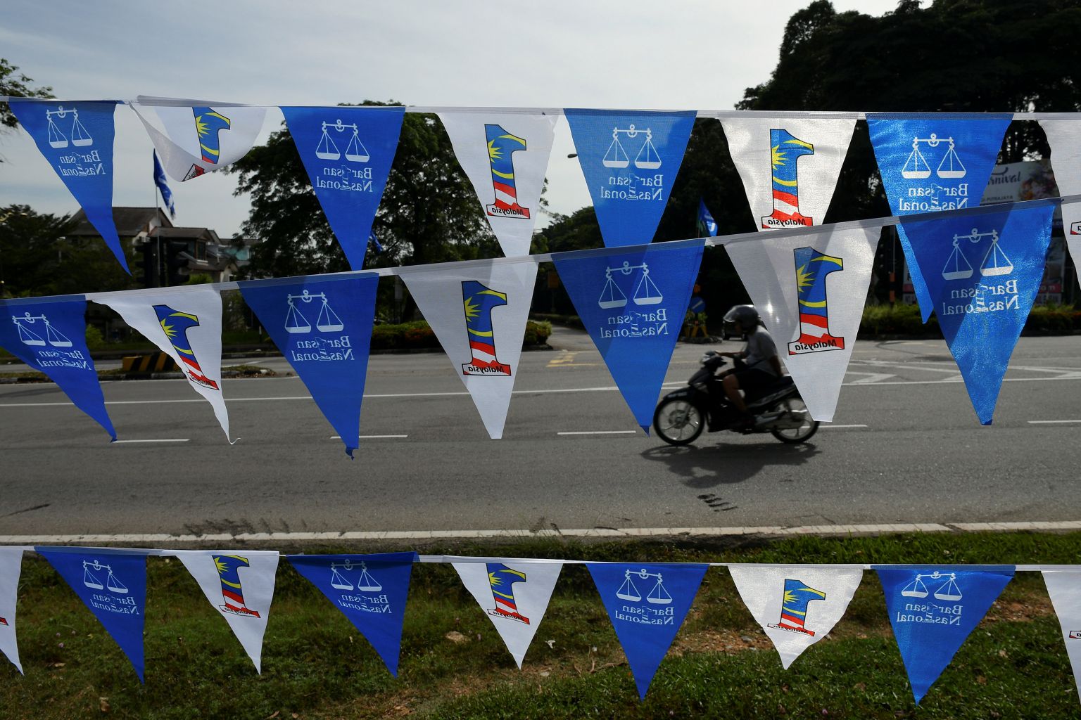A motorcyclist rides next to flags of the ruling party, Barisan Nasional, in Bangi, Malaysia, on April 10, 2018.