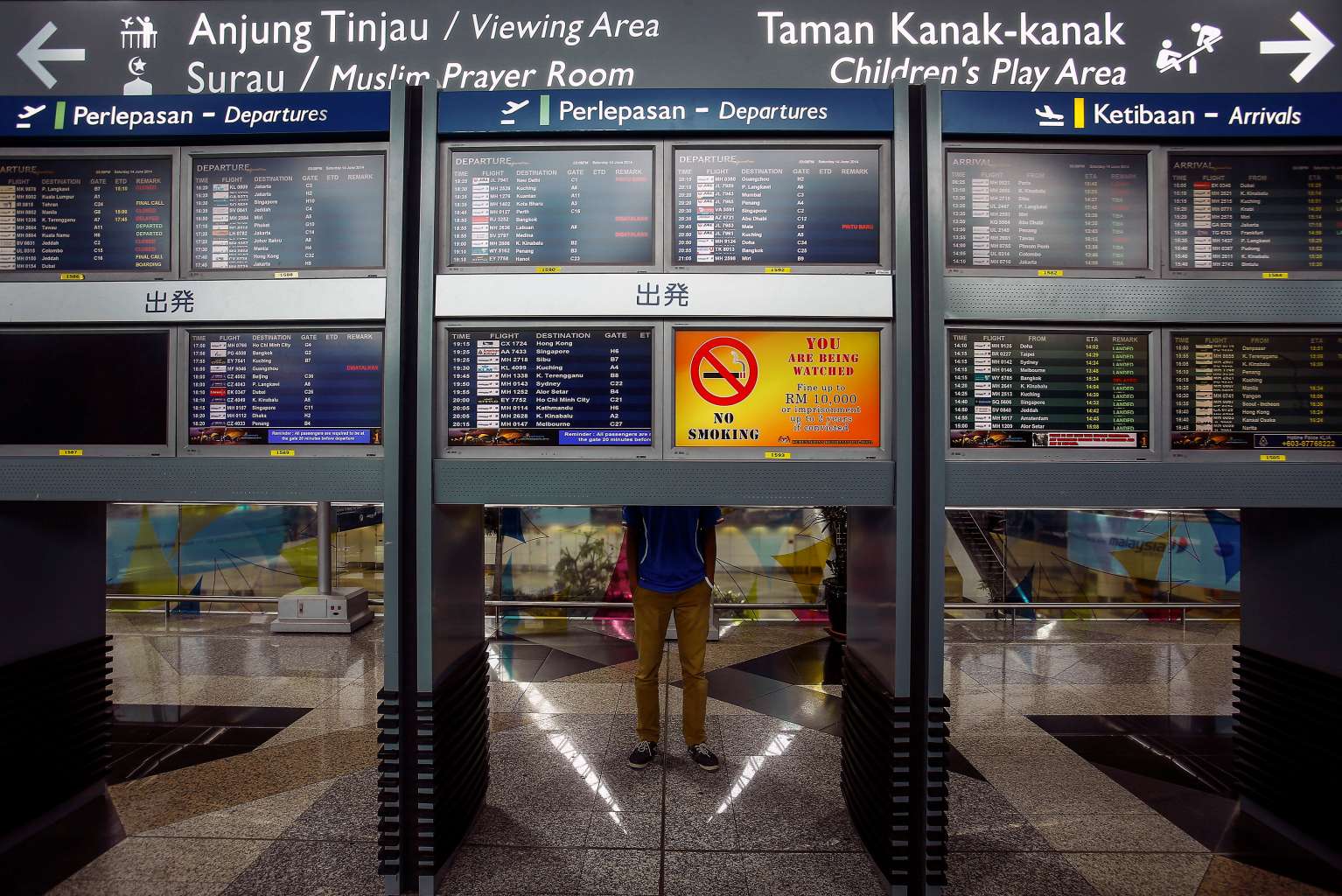A man stands near flight information boards at the Kuala Lumpur International Airport (KLIA), on June 14, 2014.