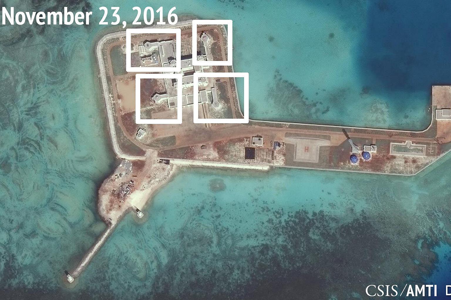 A satellite image shows what CSIS Asia Maritime Transparency Initiative says appears to be anti-aircraft guns on the artificial island Hughes Reef in the South China Sea.