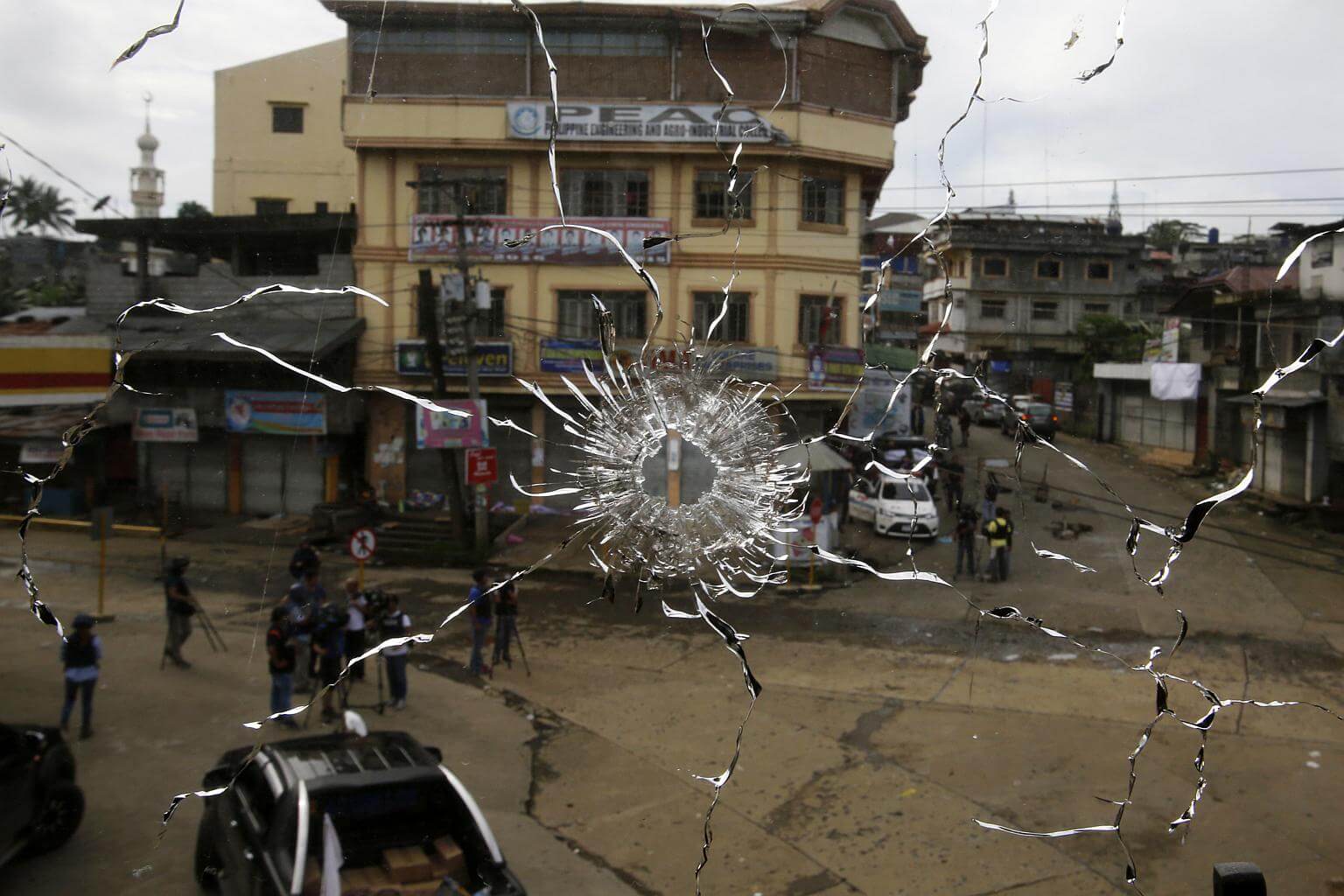 A view of a street seen through a damaged window glass from a sniper bullet during fighting between government soldiers and rebels in Marawi City.