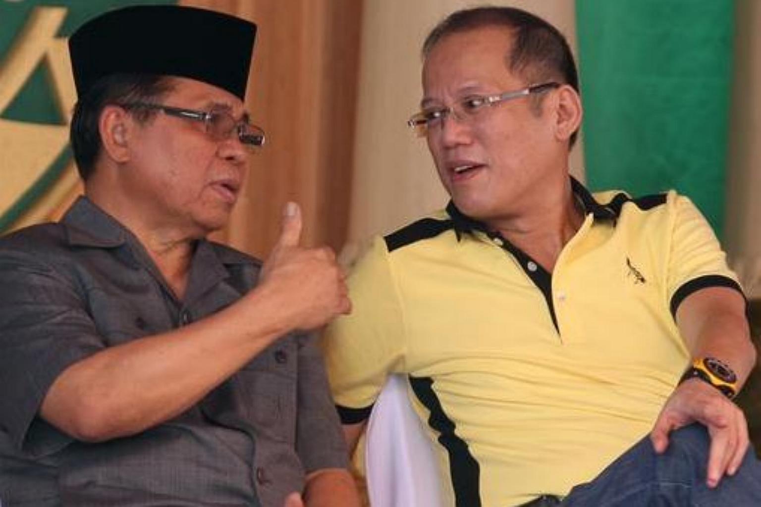 Philippine President Benigno Aquino (right) talking with Moro Islamic Liberation Front chief Murad Ebrahim during a visit to the rebels stronghold in Sultan Kudarat.