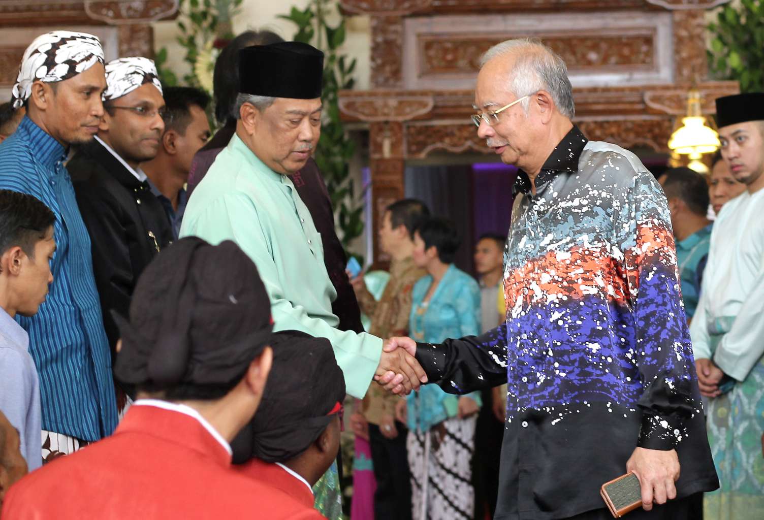 Malaysian PM Najib Razak (right) shaking hands with his deputy Muhyiddin Yassin during a wedding ceremony in June.