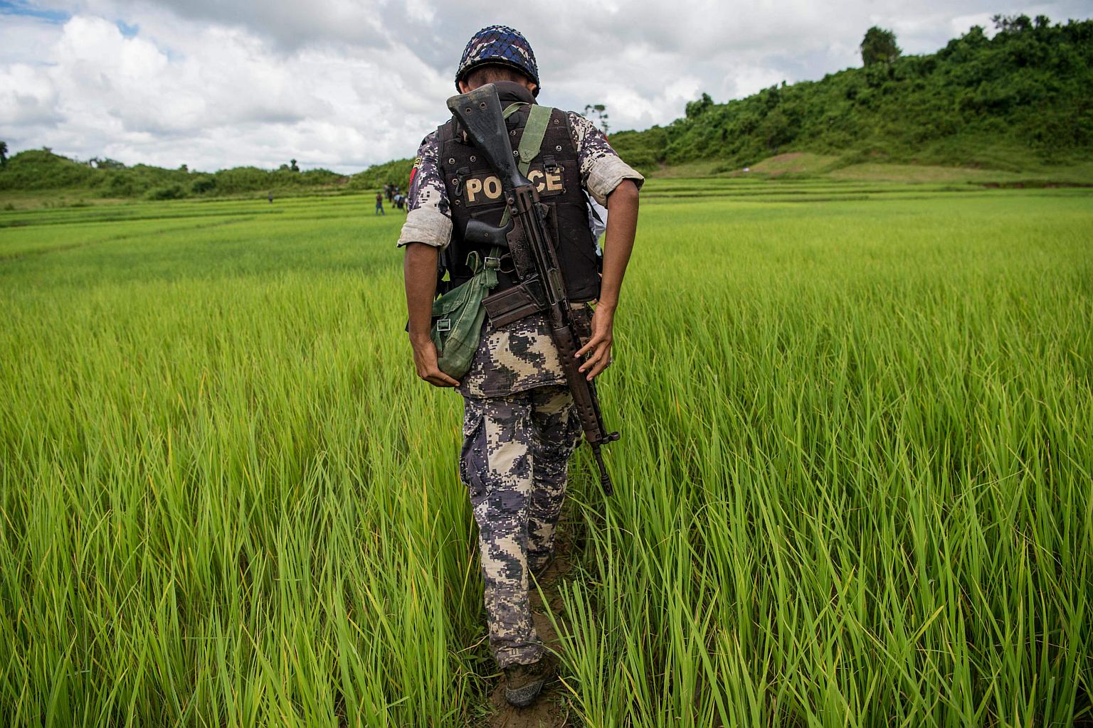 A Myanmar border police guard walks near the dead bodies (not seen) in Yebawkya village, in Maungdaw, on Sept 27.