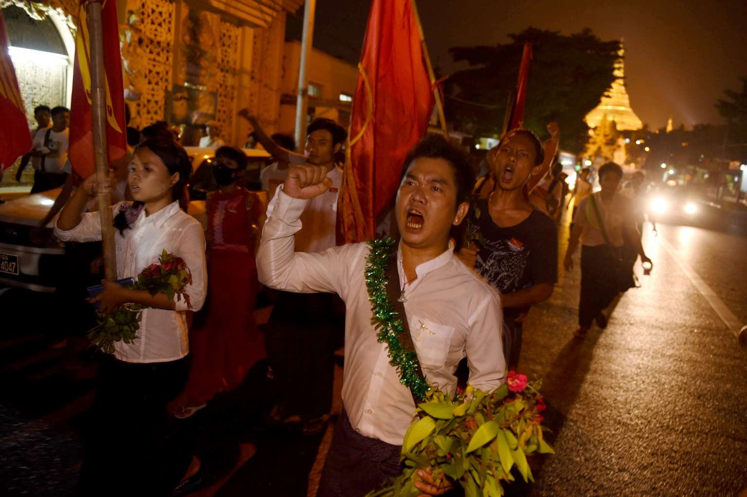 Freed students and supporters march from Shwedagon pagoda to a memorial hall upon their arrival in Yangon, on April 8.