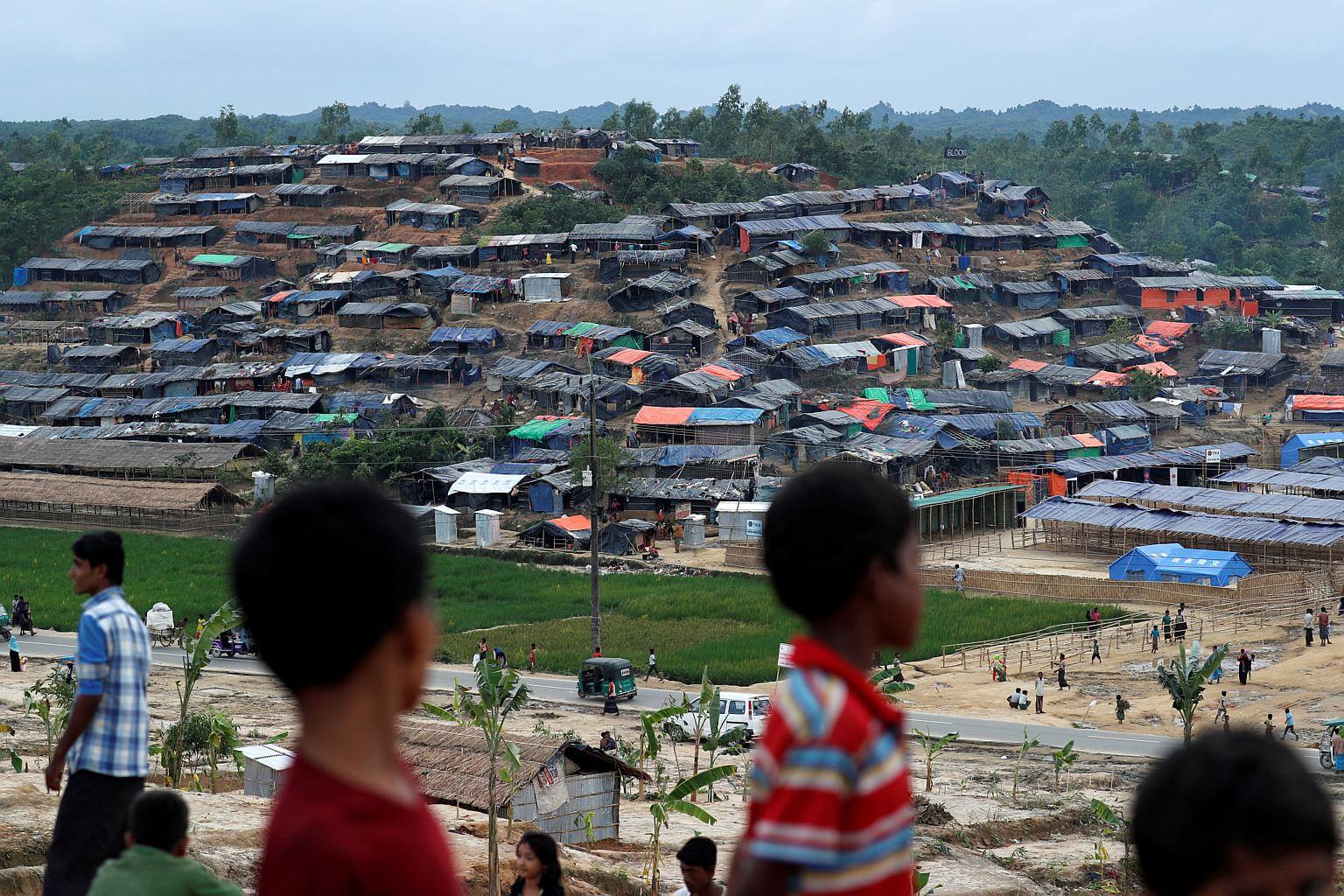 Rohingya refugees stand on a hill overlooking a new arrival at the refugee camp of Tang Khali near Cox's Bazar, Bangladesh.