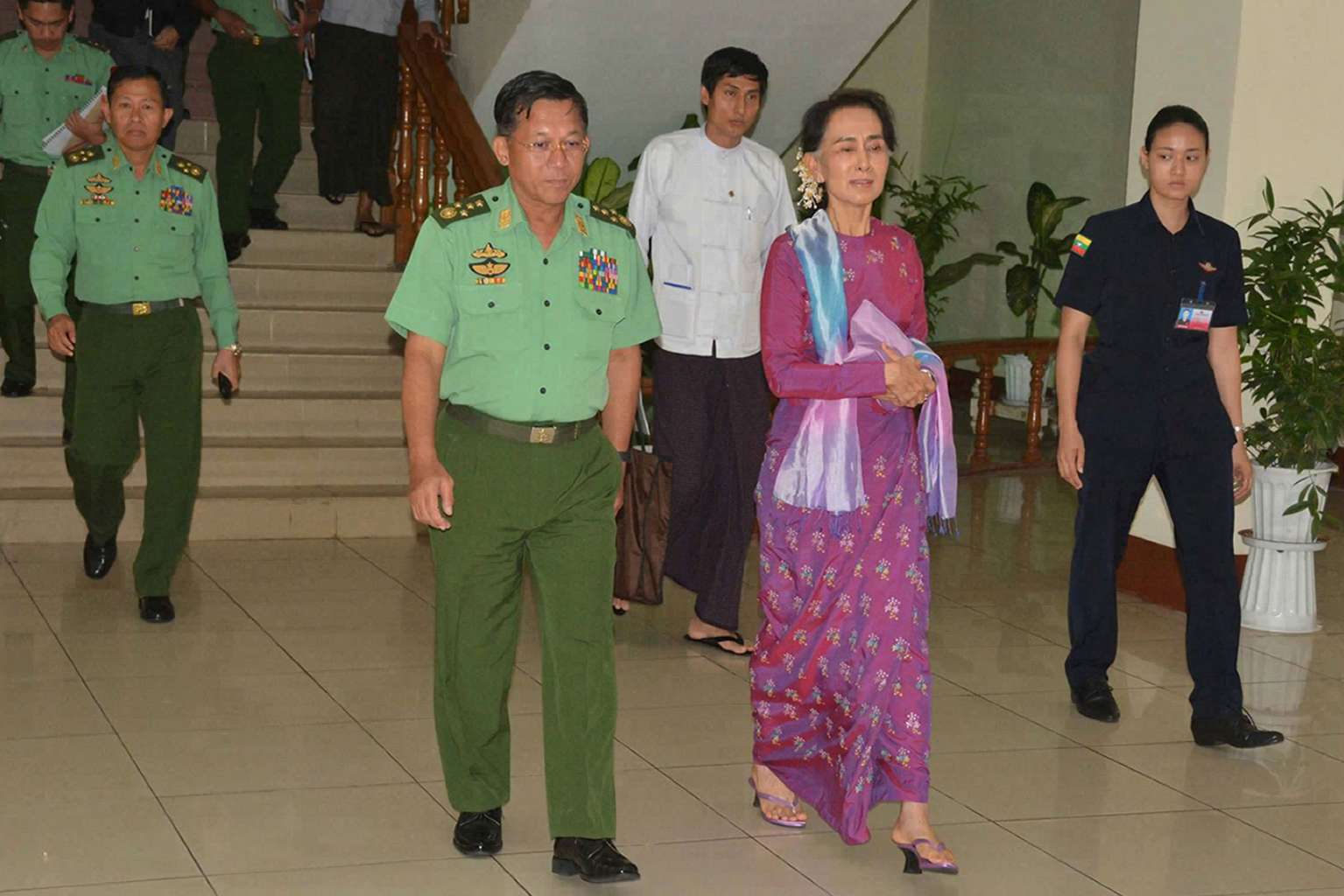 Myanmar State Counsellor and Foreign Minister Aung San Suu Kyi (right) and military chief Senior General Min Aung Hlaing (left) walk to a meeting in Naypyidaw on Aug 8, 2016.