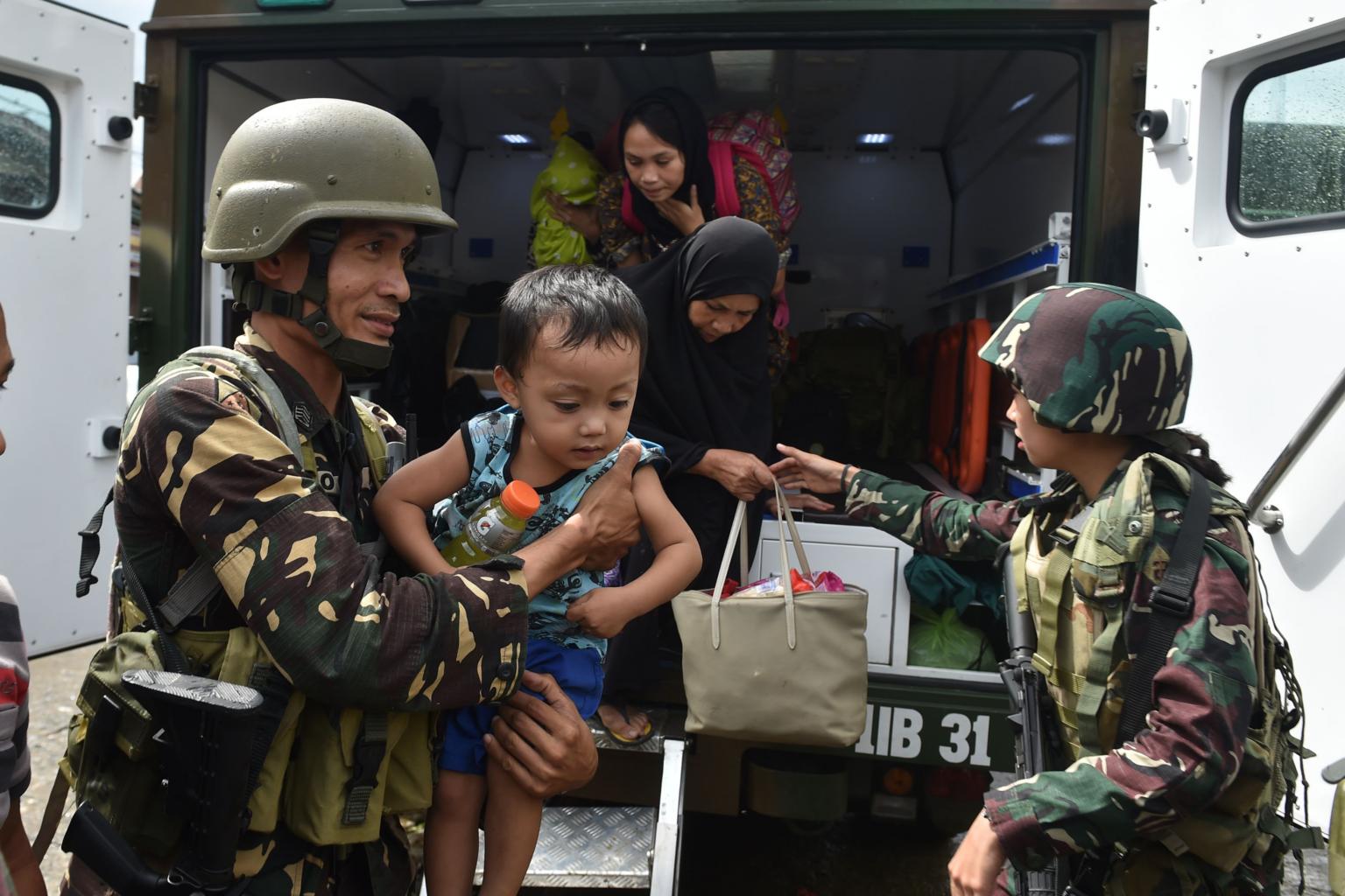 Evacuated residents disembark from a military vehicle shortly after arriving at a processing center near a hospital in Marawi on June 21, 2017.