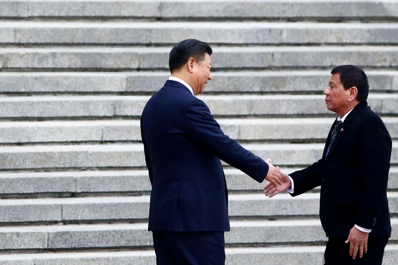 Philippine President Rodrigo Duterte (right) and Chinese President Xi Jinping shake hands as they attend a welcoming ceremony at the Great Hall of the People in Beijing on Oct 20, 2016.