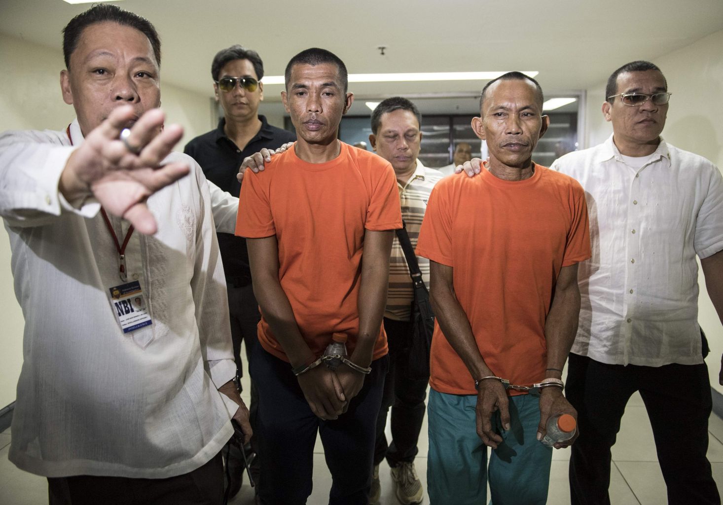 Suspected militants Hood Abdullah (in front, second from left) and Jimmy Bla are escorted by National Bureau of Investigation agents to a press conference at the bureau's headquarters in Manila, on March 12, 2018.