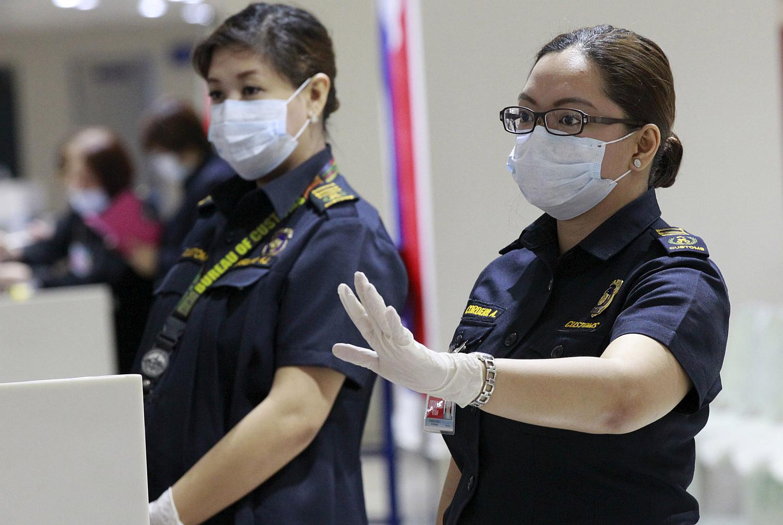 A customs inspector wearing a face mask gestures as she waits for flight passengers arriving from South Korea at the arrival area of Ninoy Aquino International Airport in Manila.