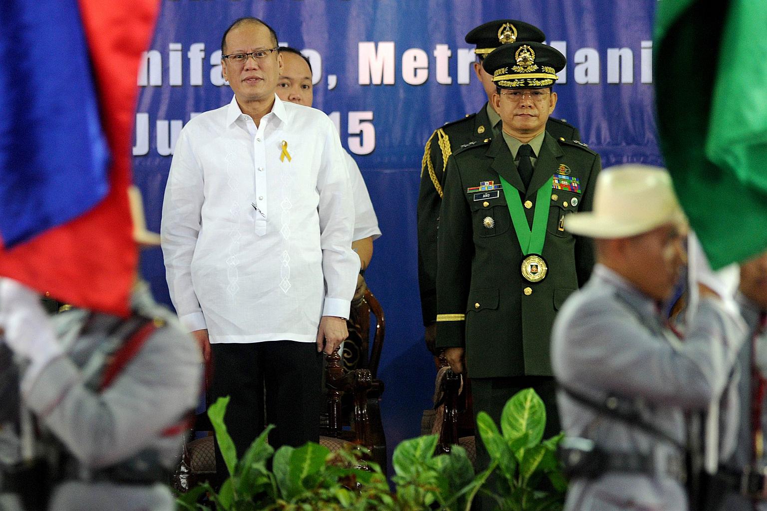 Philippine President Benigno Aquino (back left) with incoming army chief Major General Eduardo Ano (back right) during a handover ceremony in Manila on July 15, 2015.