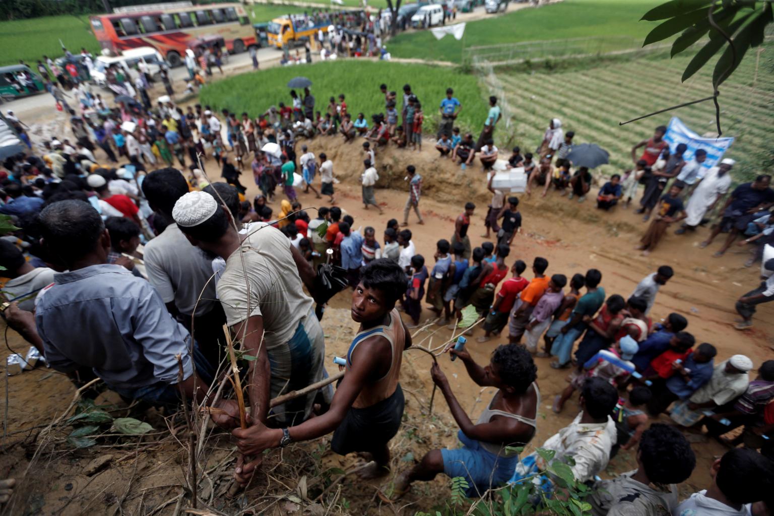 Rohingya refugees queue for aid in Cox's Bazar, Bangladesh, on Sept 24, 2017.