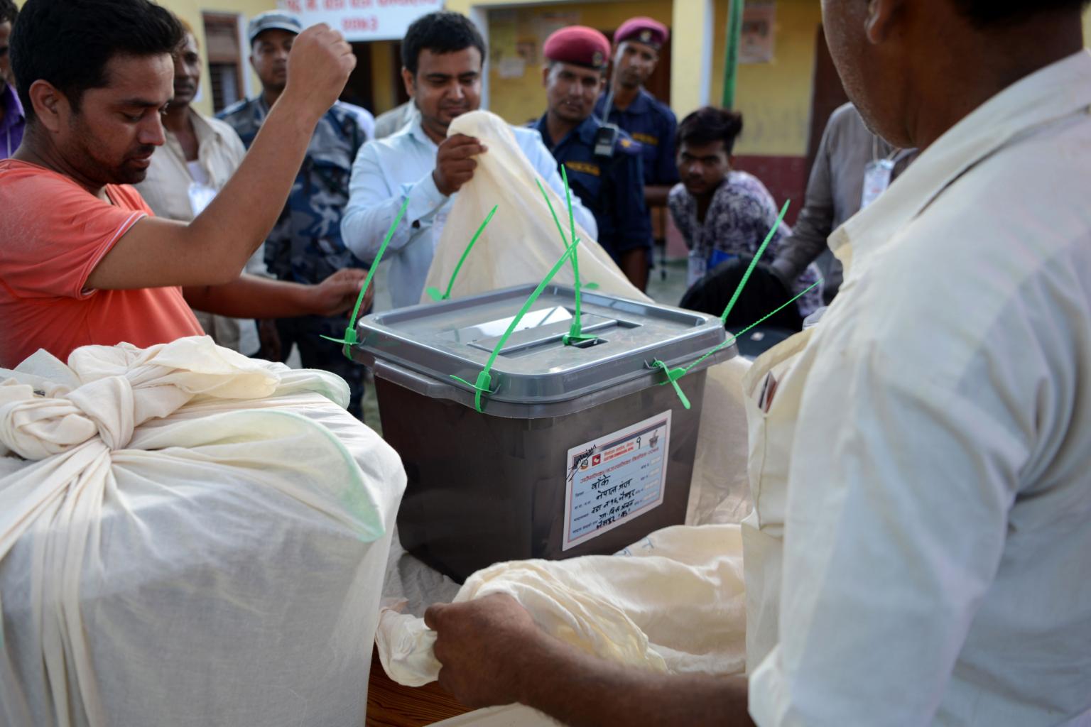 Nepalese election worker seals a ballot box after polling stations closed in Nepalgunj, some 510km south-west of Kathmandu, on June 28, 2017.