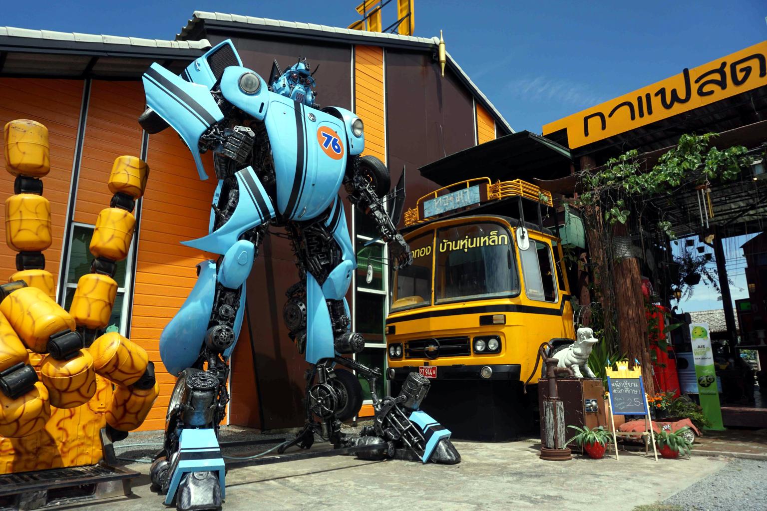 A statue inspired by the Transformers franchise in front of Ban Hun Lek, a metalworks shop renowned for giant statues of Transformers, the Hulk and other pop icons, in the central Thai province of Angthong.