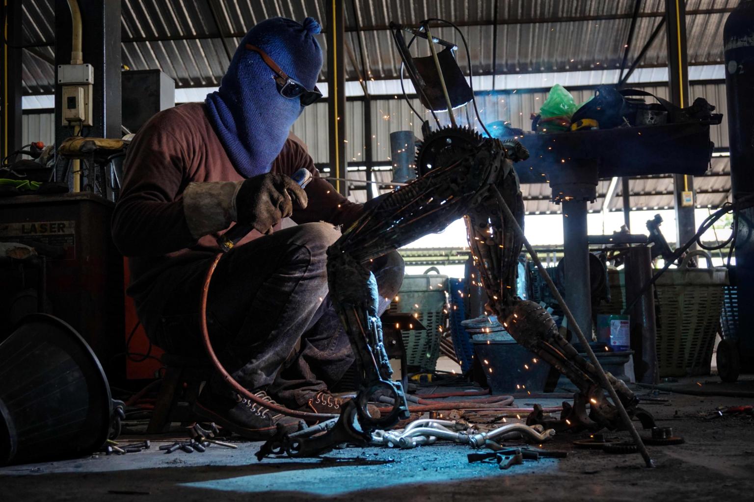 Armed with blow torches, heaps of metal bolts and twisted car parts, the artists piece together the elaborate sculptures in a warehouse in central Thailand called "Ban Hun Lek", which translates to "House of Iron Robots".