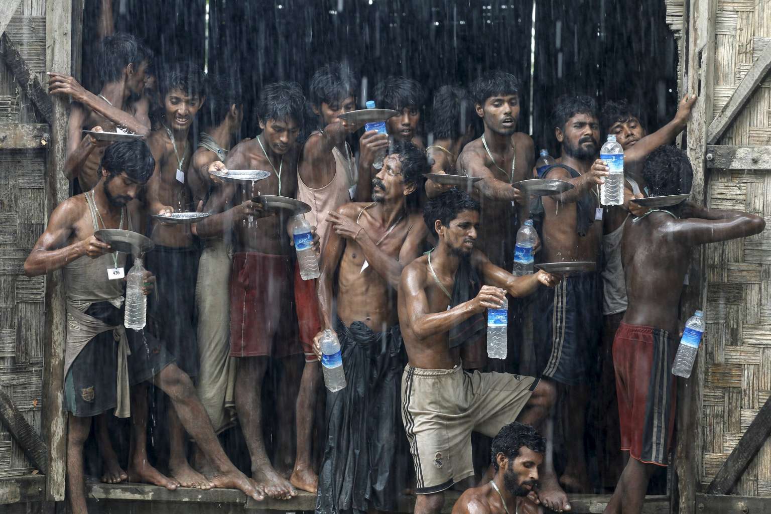 Migrants collect rain water at a temporary refugee camp near Kanyin Chaung jetty, outside Maungdaw township, Myanmar, on June 4, 2015.
