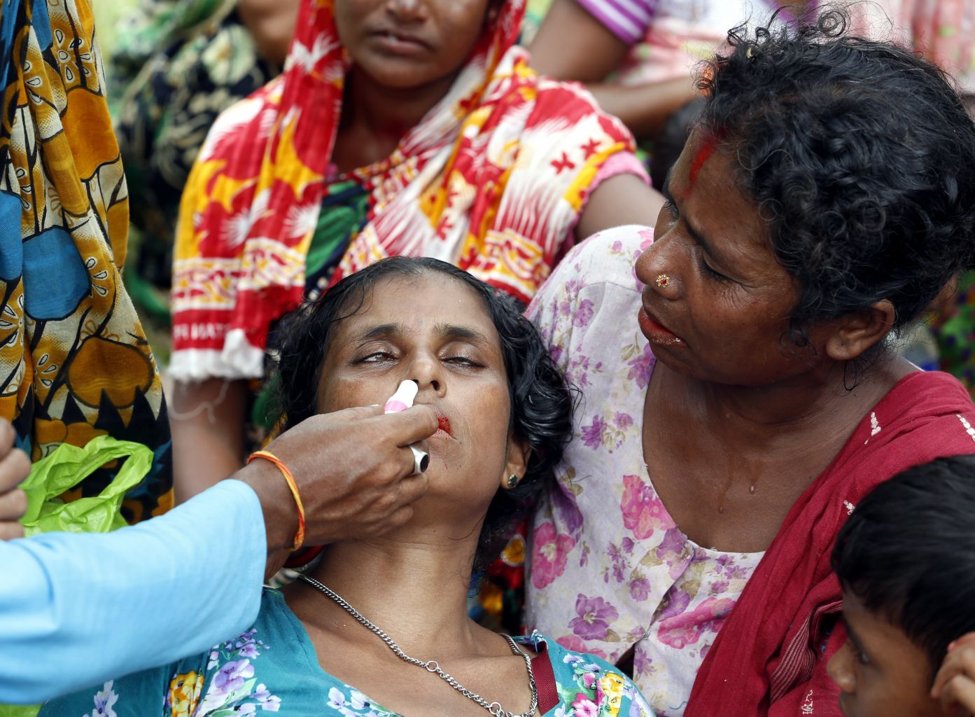 A relative of Hindu victims faints near the corpses dug from a grave in Maungdaw township in Rakhine state.