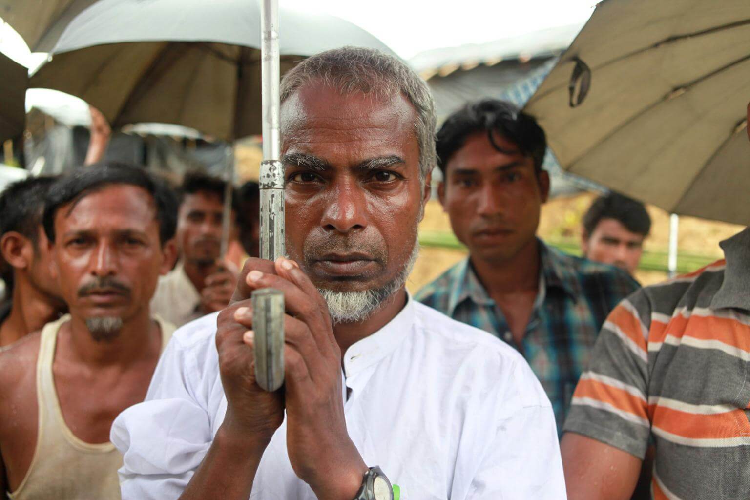 Master Kamal (centre), a 53-year-old teacher from Aung Sit Pyin village in Myanmar, posing for a picture three days after crossing the border to Bangladesh at the Balukhali refugee camp in the locality of Ukhia.