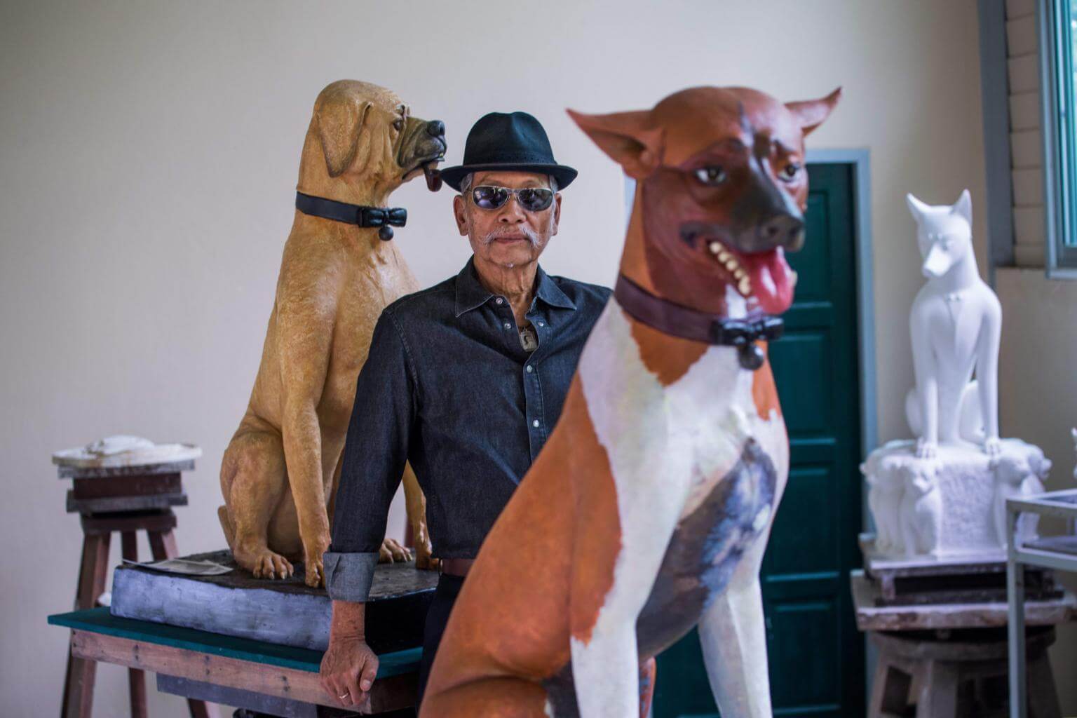 Thai sculptor Chin Prasong poses for a portrait next to two sculptures of dogs owned by the late Thai King on Aug 31, 2017.