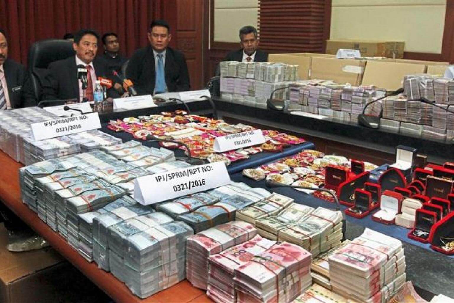 Cash and jewellery seized during the raid were displayed at a press conference in Kota Kinabalu.