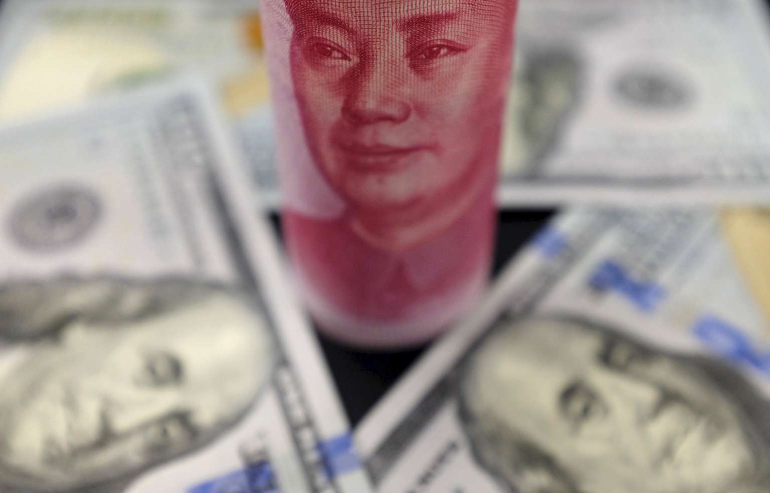 A photo illustration of US 100 dollar banknotes and a Chinese 100 yuan banknote.