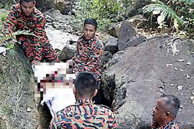 Kulai Fire and Rescue Department personnel carrying the body of David Cho, who died after plunging down the Gunung Pulai waterfall.