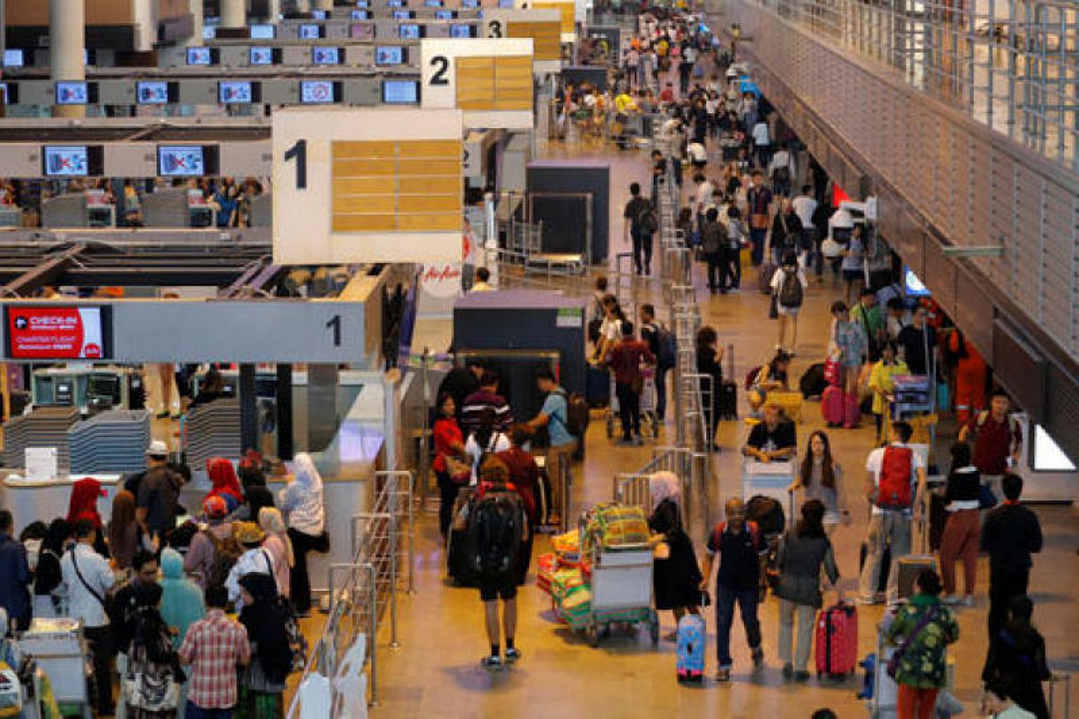 Tourists queue to check in for their flights at Don Muang International Airport in Bangkok.