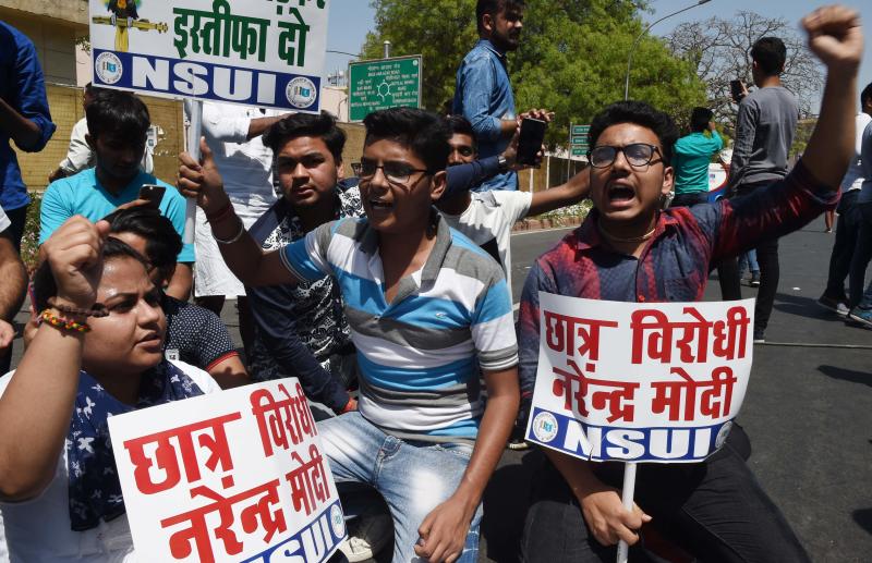 Members of the National Students Union of India hold placards as they shout slogans during a protest against Education Minister Prakash Javadekar in New Delhi on March 30, 2018.