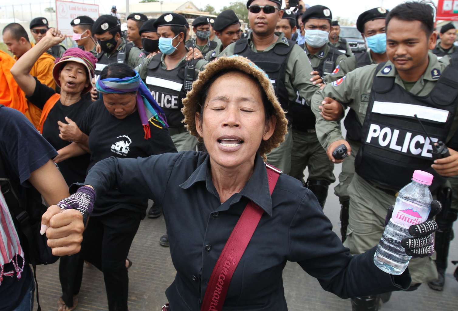 Cambodian police officers block Human Rights activists during a protest near Prey Sar prison, on the outskirts of Phnom Penh, on May 9, 2016.