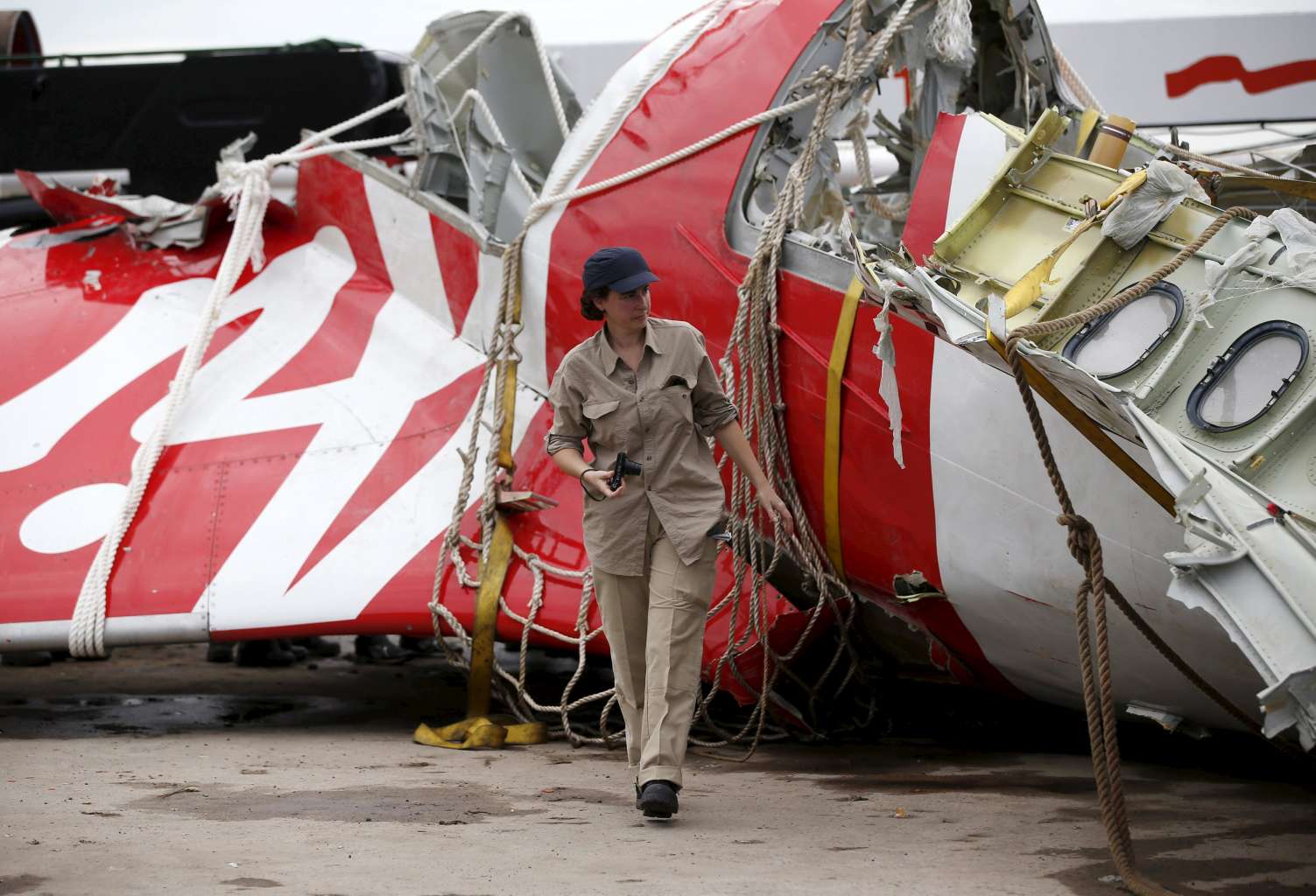 An Airbus investigator walks near part of the tail of the AirAsia QZ8501 plane in Kumai Port on Jan 12, 2015.