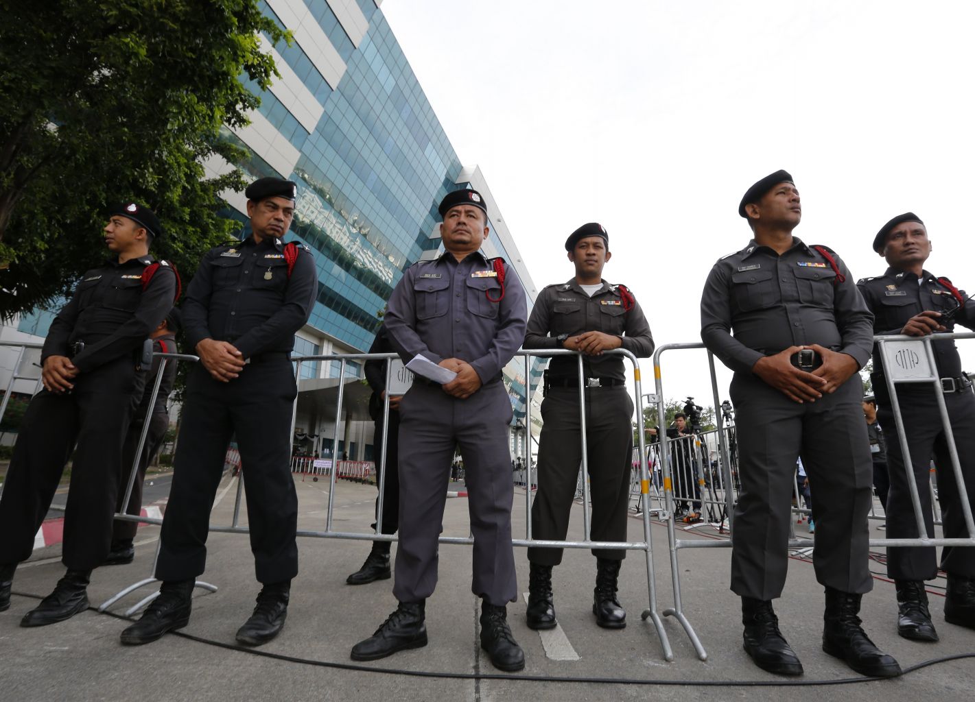Thai police officers standing guard in front of the Supreme Court's Criminal Division for Persons Holding Political Positions in Bangkok, Thailand, on Aug 25, 2017.