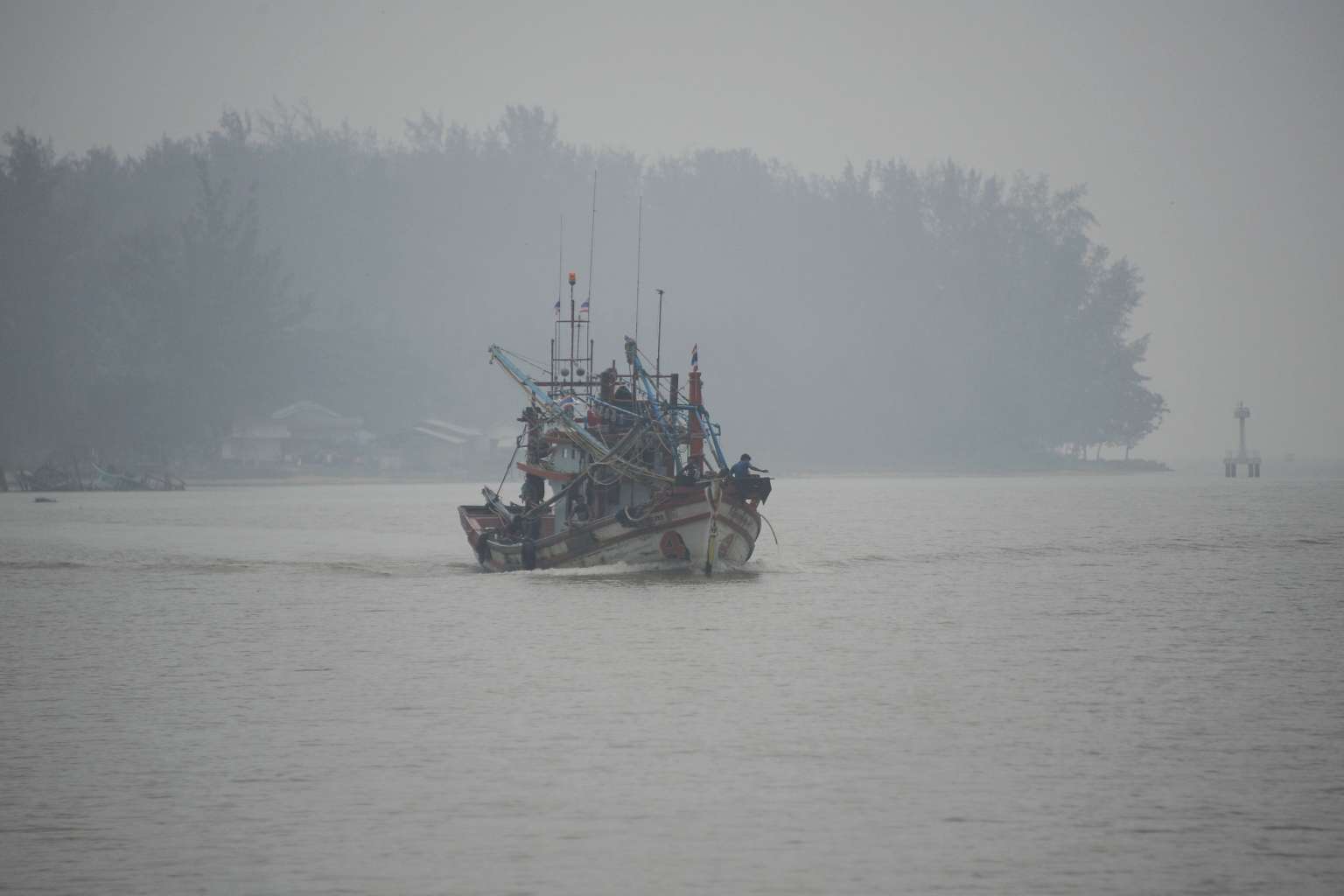 A fishing boat sailing on the Narathiwat river through haze in Narathiwat, southern Thailand.