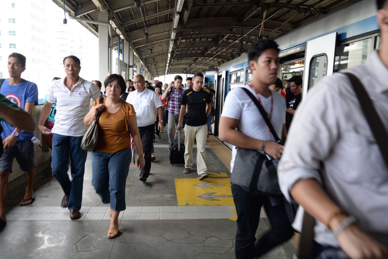People disembarking from a train at the Quezon Avenue station of the MRT in Manila.