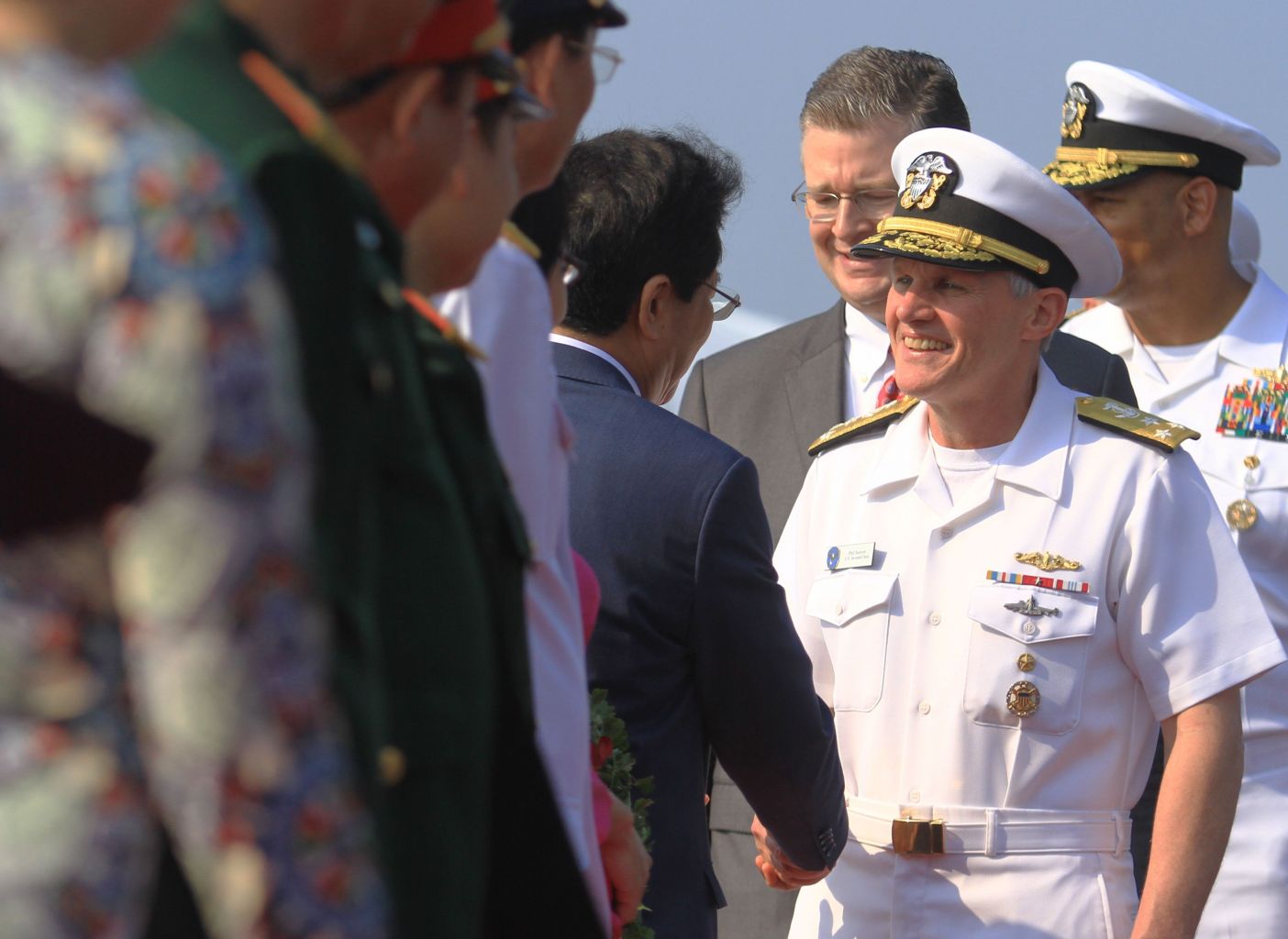 Vice Admiral Phillip G. Sawyer (right), commander of the US Navy's Seventh Fleet, greets Vietnamese officials after the US aircraft carrier USS Carl Vinson pulled into port in Danang on March 5, 2018.