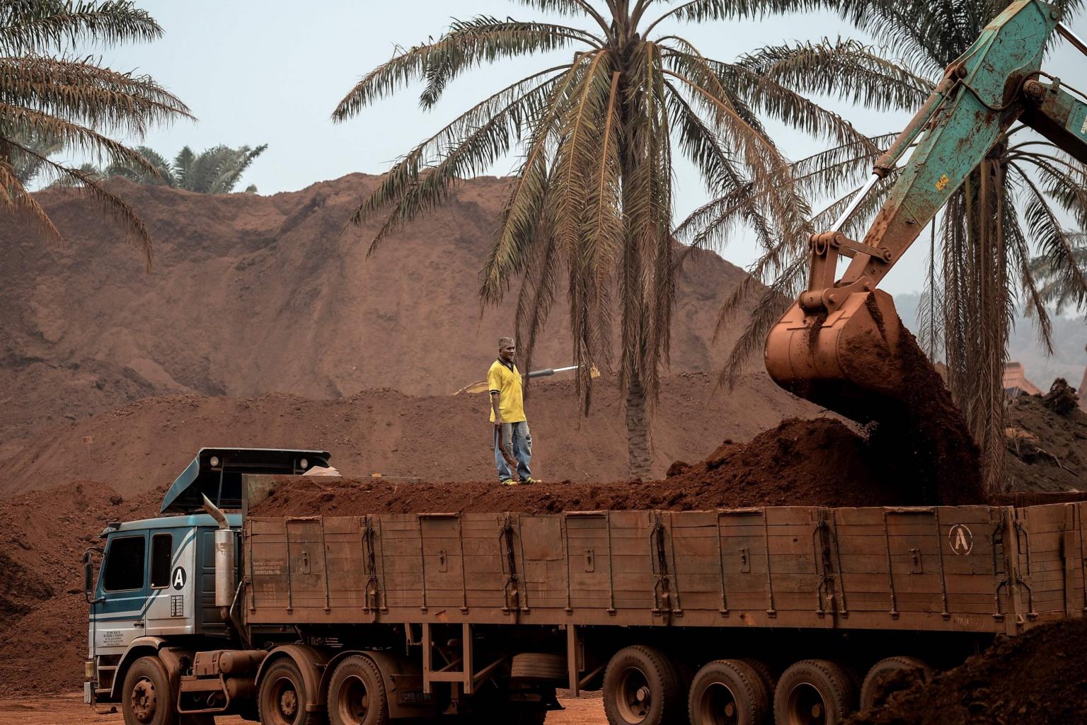 A truck driver watches as an excavator loads his vehicle at a bauxite storage site in Pahang, Malaysia.