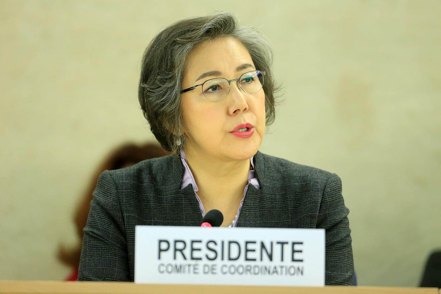 Chair of Coordinating Committee of Special Procedures Yanghee Lee addresses the Human Rights Council 26th Special Session on the human rights situation in South Sudan, Geneva, Switzerland on Dec 14, 2016.