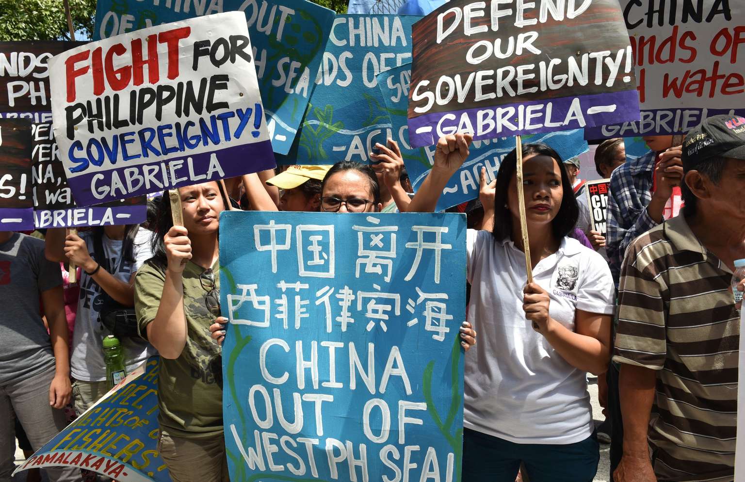Activists hold placards during a protest in front of the Chinese consulate in Manila on July 12, ahead of a UN tribunal ruling on the legality of China's claims to an area of the South China sea contested by the Philippines.