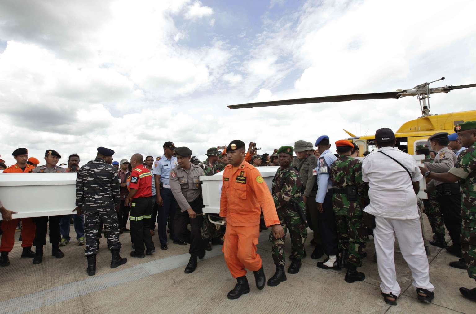 Indonesian rescuers and military personnel carrying coffins containing the victims of a crashed cargo, in Timika, Papua province, on Nov 1, 2016.