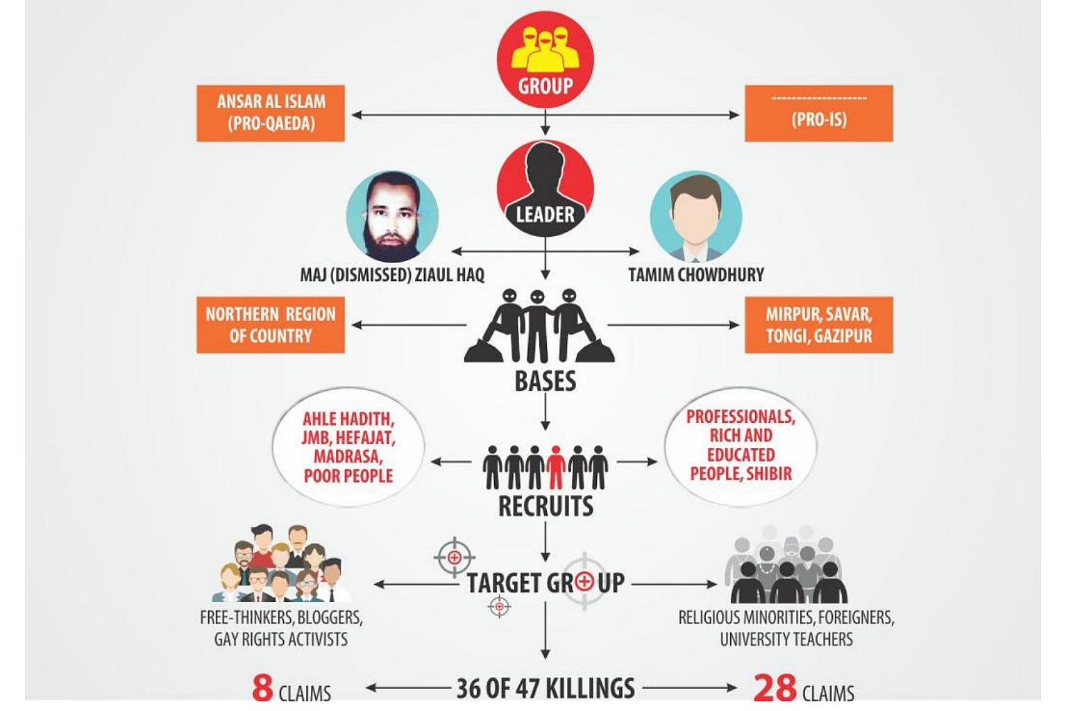 On May 22, Amir Hossain Amu, chief of the Cabinet committee on law and order maintenance, told the press that JMB was directly involved in 25 recent killings, Ansarullah Bangla Team (renamed Ansar Al Islam) in eight and other militant groups in four.