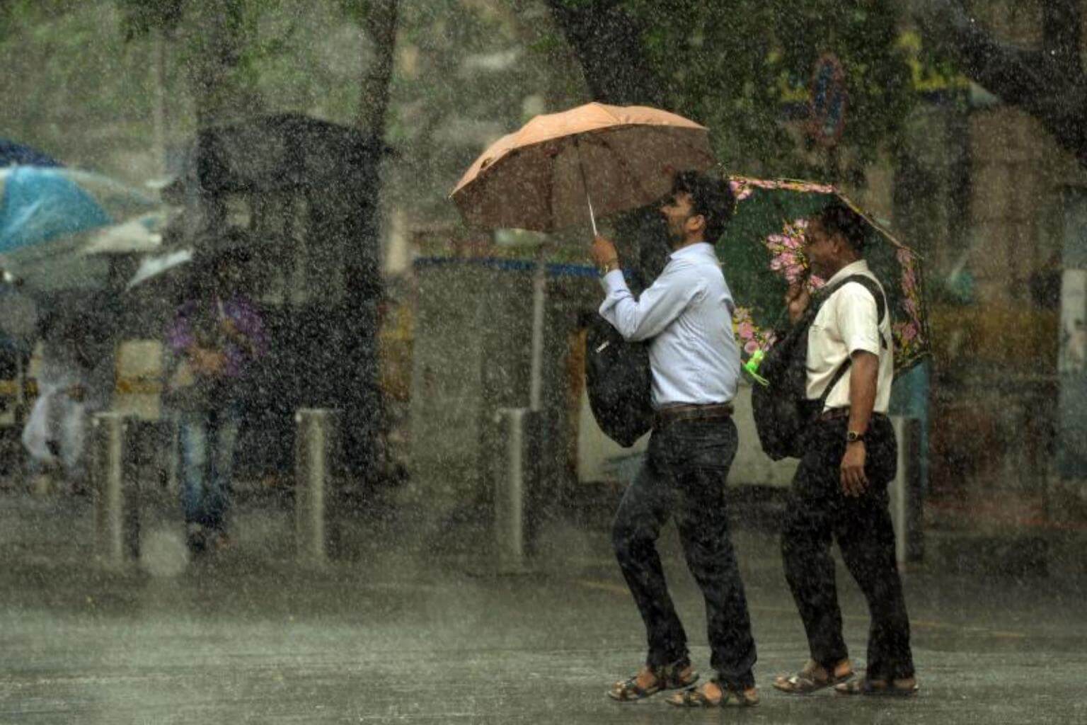 Indian pedestrians carry unbrellas as they walk through heavy rain showers in Mumbai on July 13, 2017.