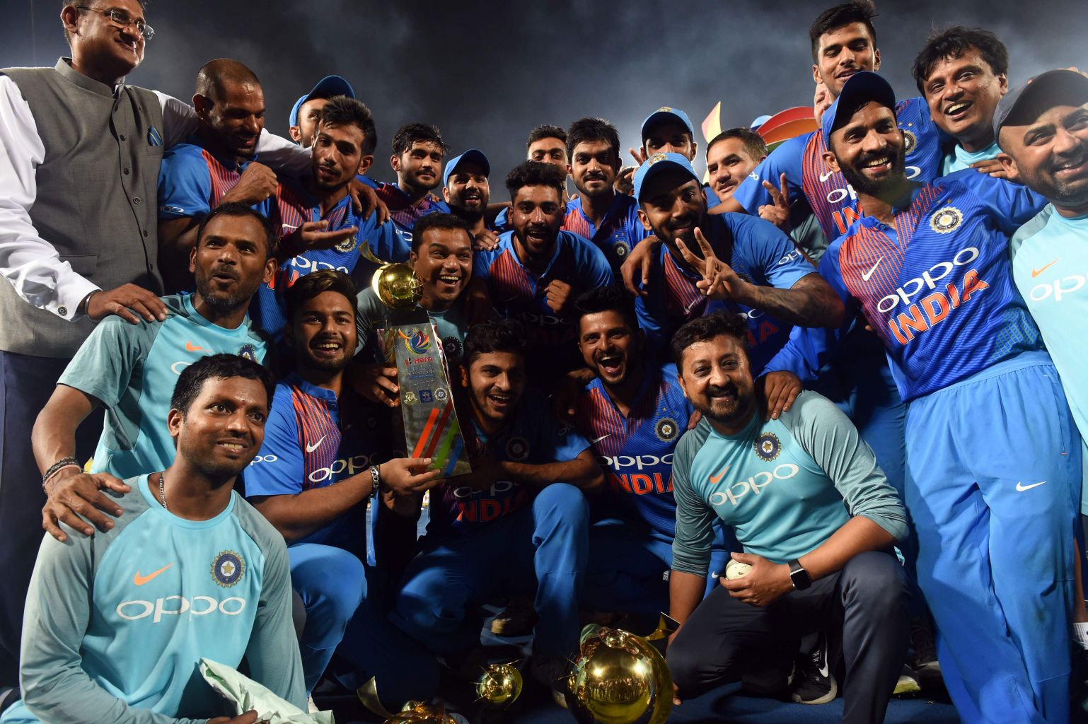 Indian players celebrating their victory over Bangladesh with the Nidahas Twenty20 Tri-Series international cricket trophy on March 18, 2018.