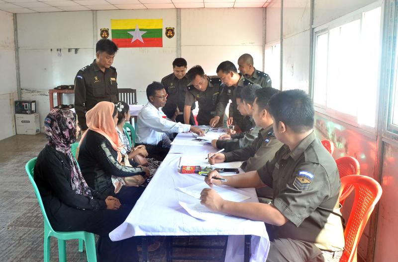 Myanmar immigration officials hand over identification documents to an unidentified Rohingya woman belonging to the five-member Rohingya family at the repatriation camp at Taungpyoletwei town in Maungdaw, near the Bangladesh border on April 14, 2018.