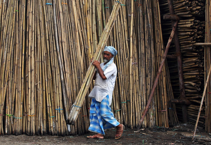 A man stacks bamboo sticks inside a godown in Mumbai, on Aug 10, 2017.