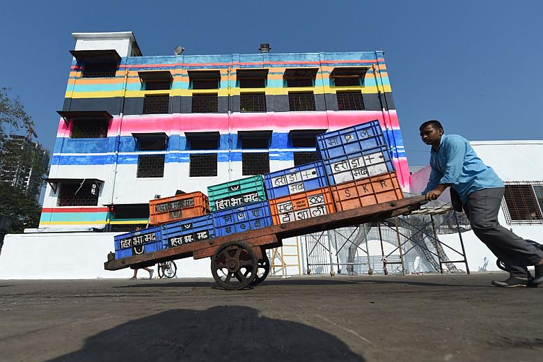 A man pushing his cart load of fresh fish past the main venue of the St+art Festival at Sassoon Dock, one of the oldest fishing docks in Mumbai.